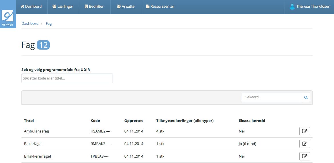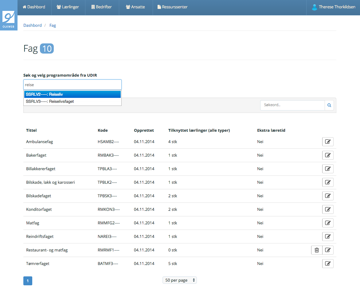 Når man har lagt til fagene på opplæringskontoret, kan man hente disse, og vise hvilke av dem som er tilgjengelig i de forskjellige bedriftene. Det er også disse fagene som man knytter lærlingene opp mot i opprettelsen/endringen. I faglisten her ser man også hvor mange lærlinger som er tilknyttet det faget, og eventuelt om det er har ekstra læretid eller ei. Det er kun fag uten tilknyttede lærlinger som man har mulighet til å fjerne fra listen.