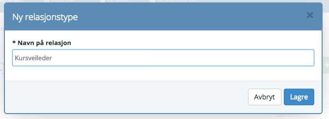 Klikk på "+ Ny relasjonstype" for å lage en ny relasjon. Skriv inn hva man ønsker å kalle relasjonen, og velg "Lagre".