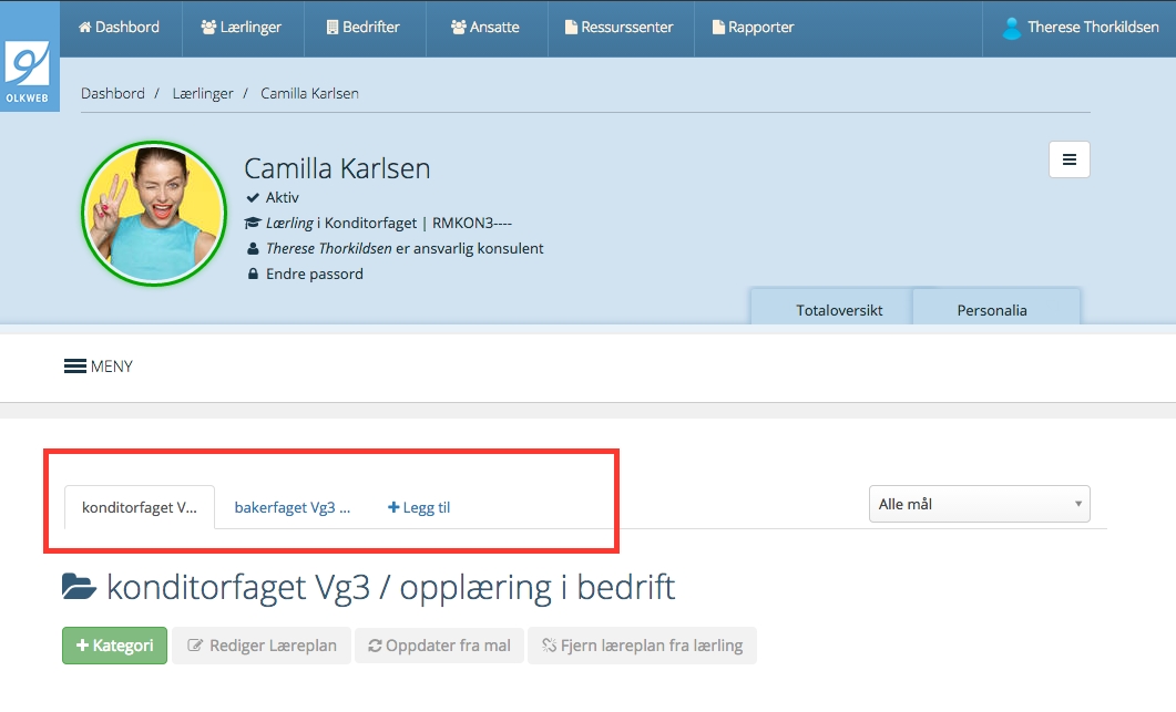 For å knytte en læreplan opp mot en lærling går man da på en lærlingsin profil, og velger læreplan fra menyen. Dersom lærlingen ikke er importert inn, vil h*n sannsynligvis ha en læreplan liggende fra når h*n ble opprettet i systemet. Det kan opprettes så mange læreplaner man måtte ønske på en lærling.